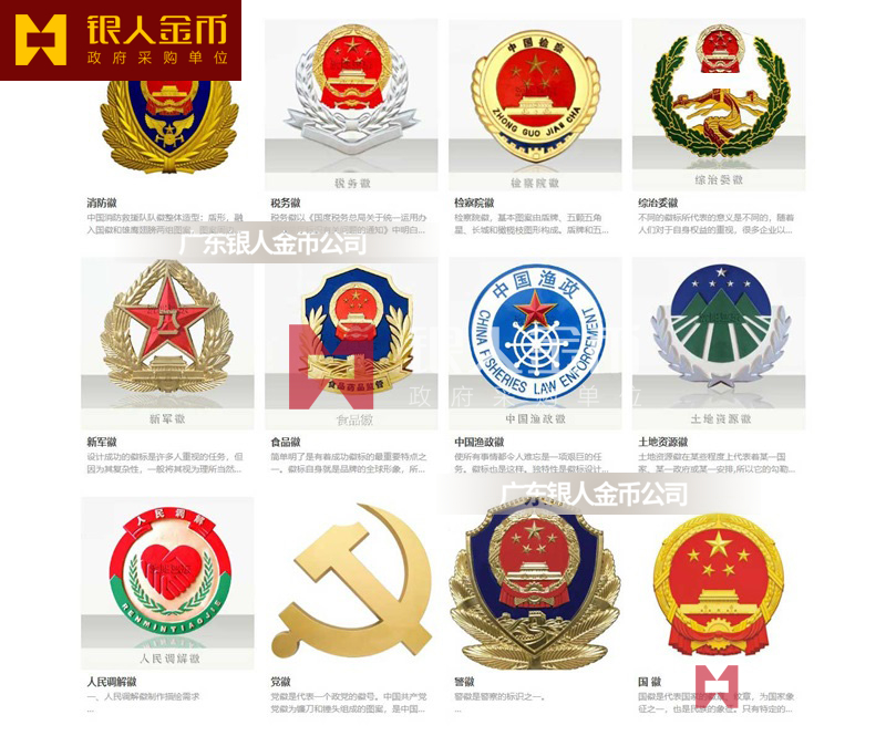 我厂现有生产的徽标有,国徽、党徽,政协徽,法院徽,检察院徽,团徽,质检徽,海事局徽,消防徽,高速公路徽、税务徽、司法徽,共青团徽、少先队徽、工商徽、劳动仲裁徽、公证徽、气象徽、人口徽、工会徽、城管徽(行政执法徽)、民政徽、劳动仲裁徽、动物卫生监督徽,质量技术监督徽,环保徽,交通徽,公路徽,人民调解徽,计划生育人口会徽、人民调解徽、土地徽、环保徽、气象徽、消防徽。