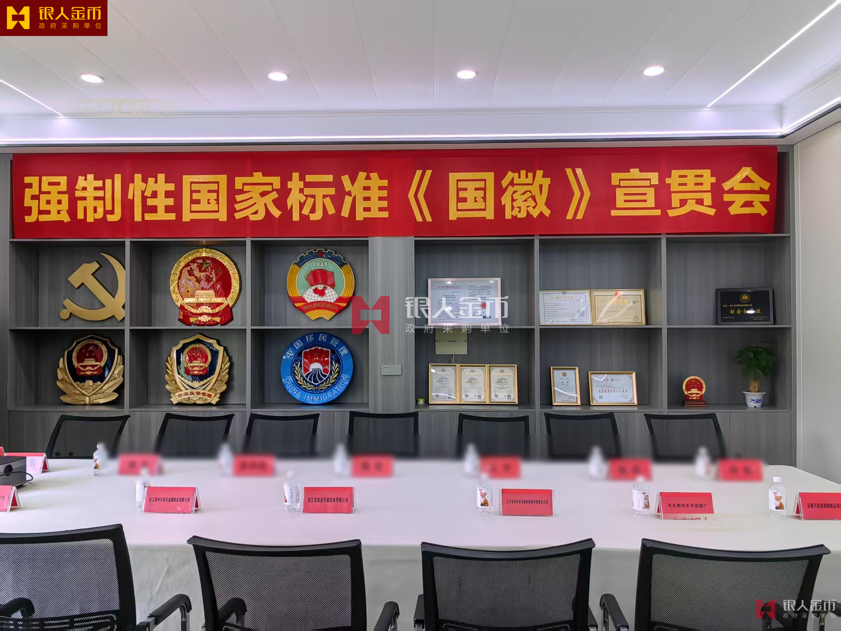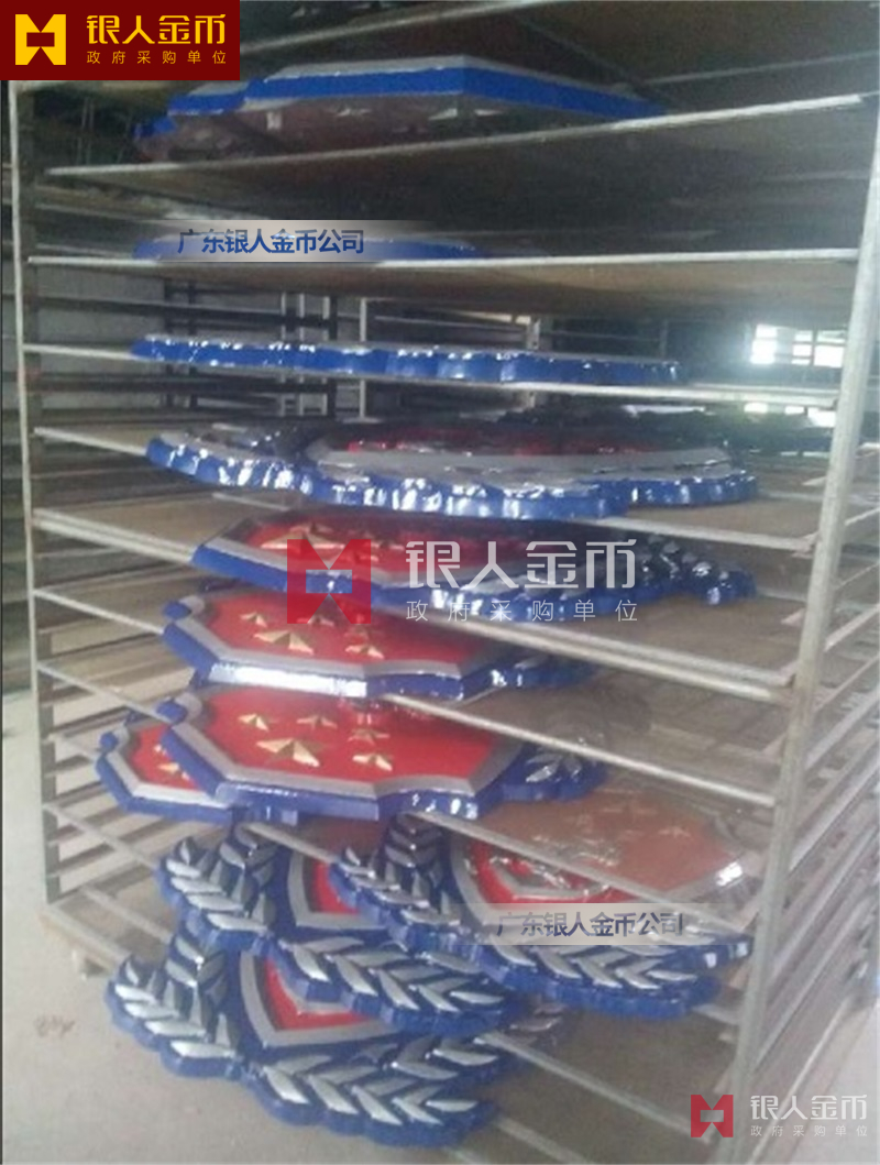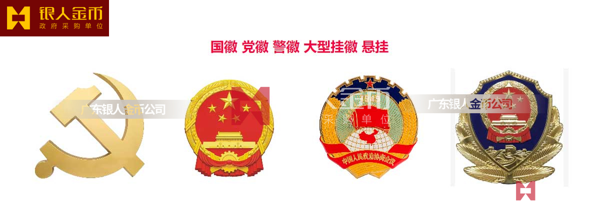 广州银人徽章厂有限公司-是广东省一家专业以研发.设计.铸造.生产销售一体的大型企业.徽章严格按国家标准设计与制作.以优质的ZL102铸造铝合金、铜、合金、锌合金、合金、锌等为材料.经高温.浸透压延铸制造技术,采用高级汽车烤漆房.高光泽静电匀布式喷烤漆工艺处理,挂徽表面喷涂进口透明防腐蚀漆加以保护.该产品具有重量轻,牢固强.拒风雨.抗日晒.色彩鲜艳.保持不褪色特点.挂徽美观庄重.雄伟庄严.是政府大楼,机关单位.企事业学校等必备悬挂标志。