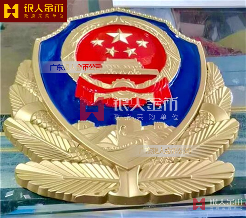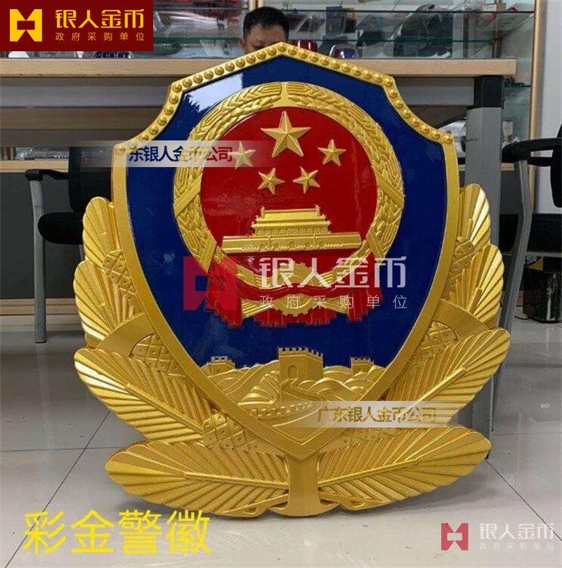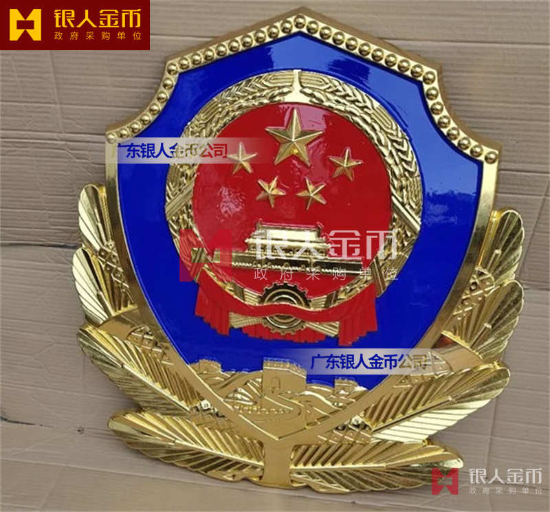 警徽制作 1米警徽压铸工艺重量约6公斤,背面有6个悬挂孔,可承受重量100斤左右,警徽采用铝合金材质制作,重量轻不生锈,警徽具有抗氧化不褪色等各种特点;