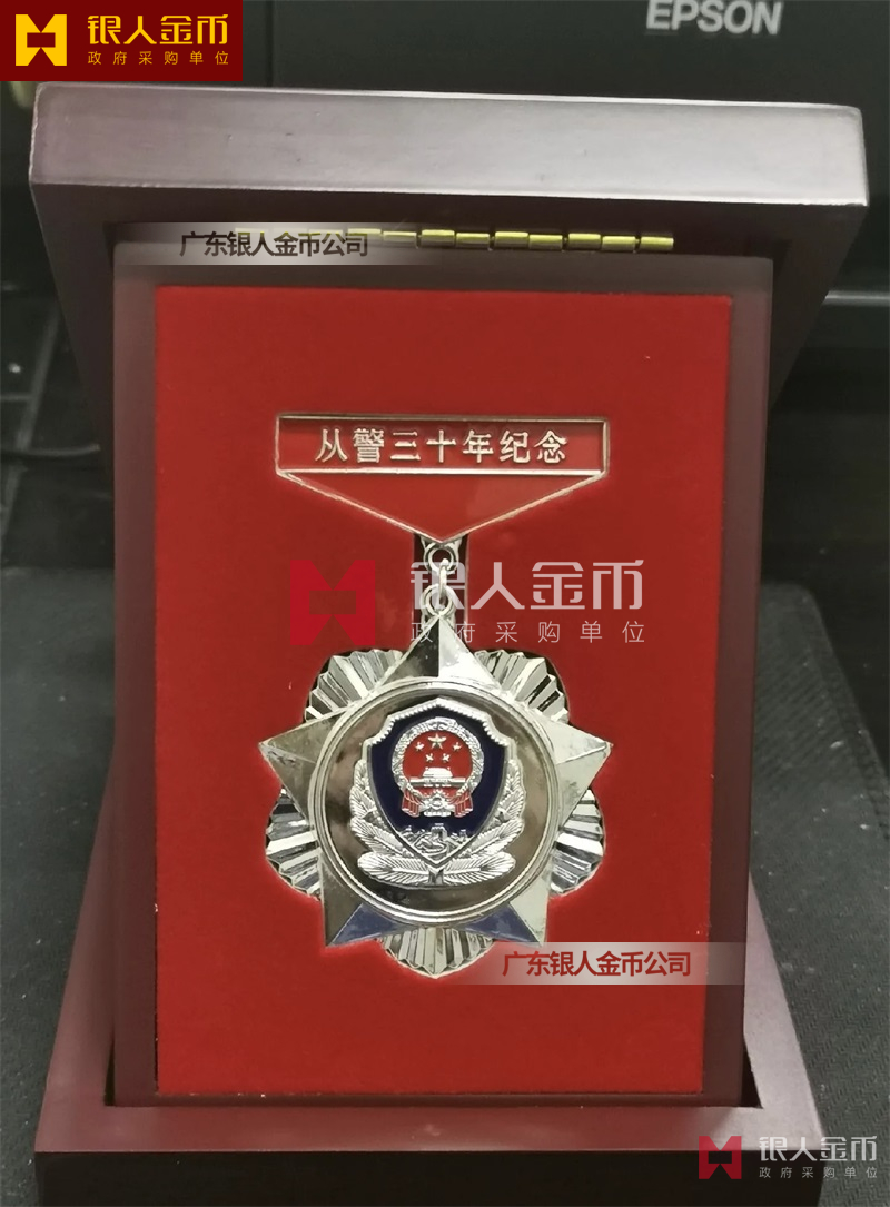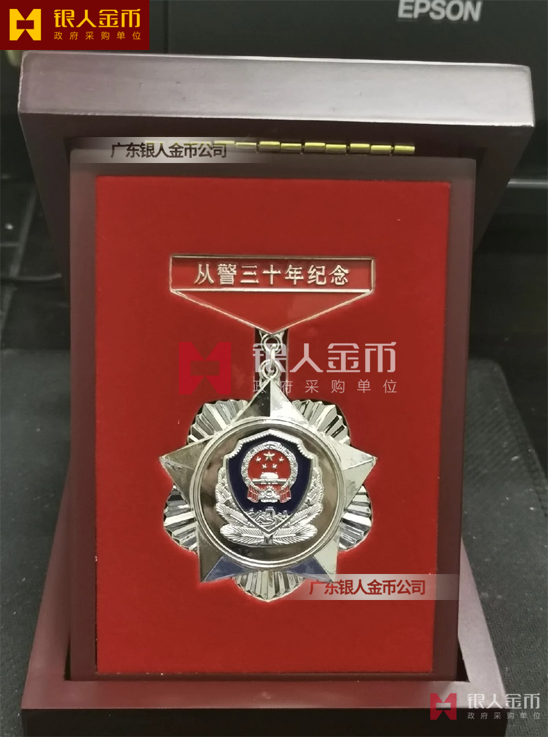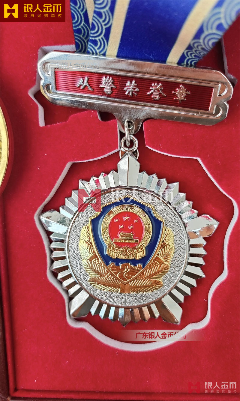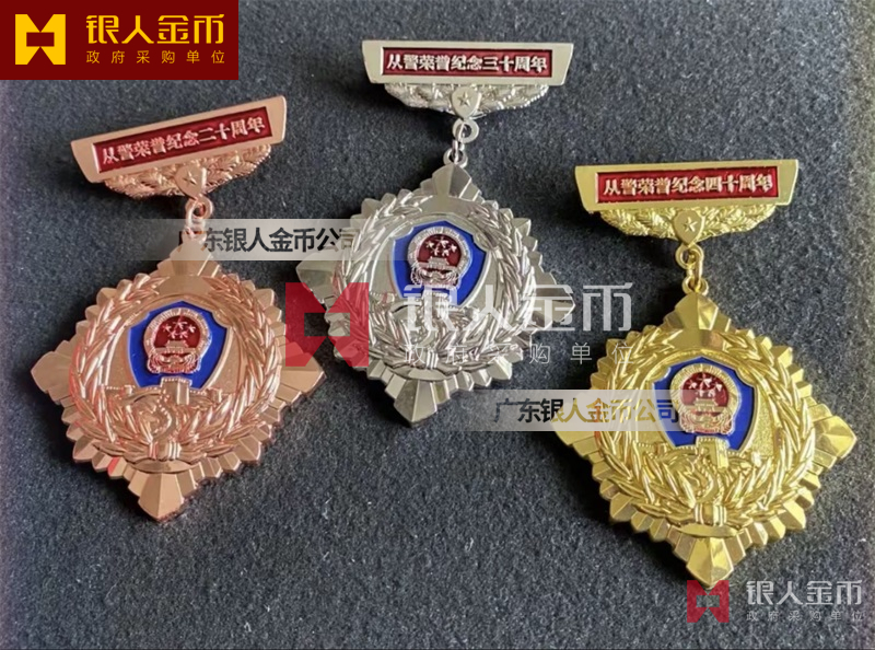 从警纪念章定制,从警年限纪念章定制,从警奖章定制——从警纪念章的底下主体部分都是警徽,上面横档部分是不相同的,有:“从警十年纪念(从警10年纪念章)”、“从警二十年纪念(从警20年纪念章)”、“从警三十年纪念(从警30年纪念章)”、“从警四十年纪念(从警40年纪念章)”不同的,从警十年纪念章(从警10年奖章)表面是镀铜色(铜质奖章)、从警二十年纪念章(从警20年奖章)表面镀银色(银质奖章)、从警三十年纪念章(从警30年奖章)和从警四十年纪念章(从警40年奖章)表面镀金色(金质奖章) ,整体将从警奖章或从警纪念章(从警特定年限纪念章也叫从警章)镶嵌在三折的立式木盒上面,木盒外面配有纸盒,整体做工精美,木盒纸盒上面都刻有警徽从警年限等。