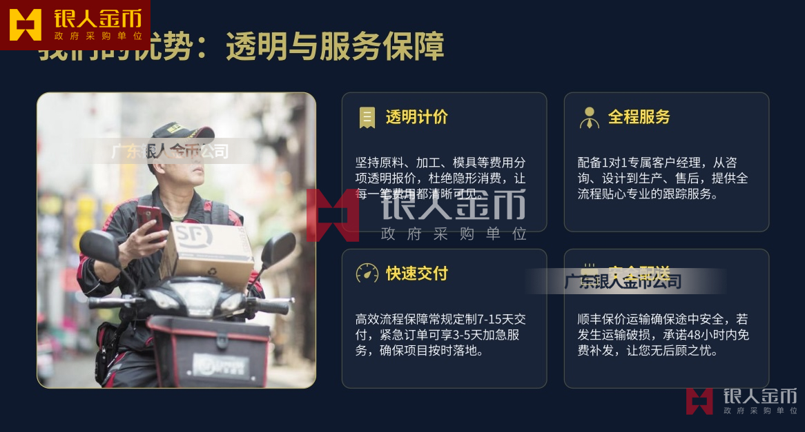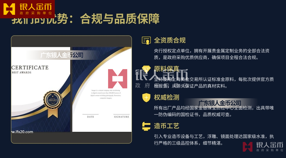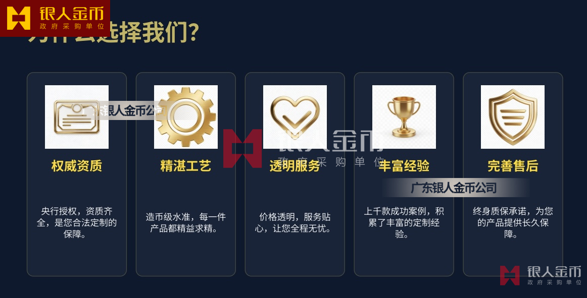 - 权威背书:政府外事用品采购单位、勋章奖章制造单位,连续多年 “广东省守合同重信用企业”广东银人金币。
