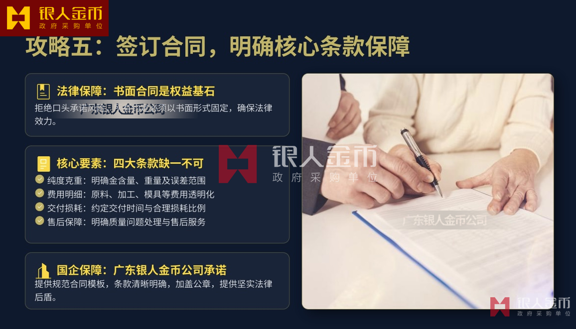 - 签订合同→支付 30%-50% 定金→锁定金价广东银人金币有限公司