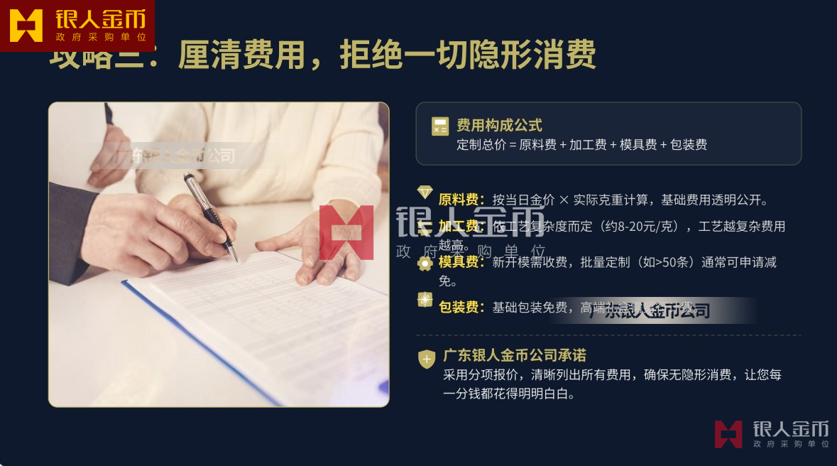 - 费用构成:总价 =原料费 + 加工费(30-80 元 / 克)+ 模具费(6000 元起,批量≥50 免)+ 证书费(50 元 / 张)+ 包装费,无隐形消费广东银人金币。