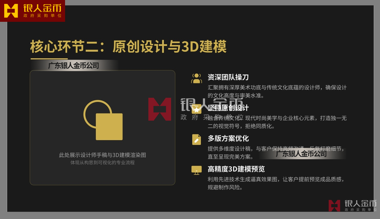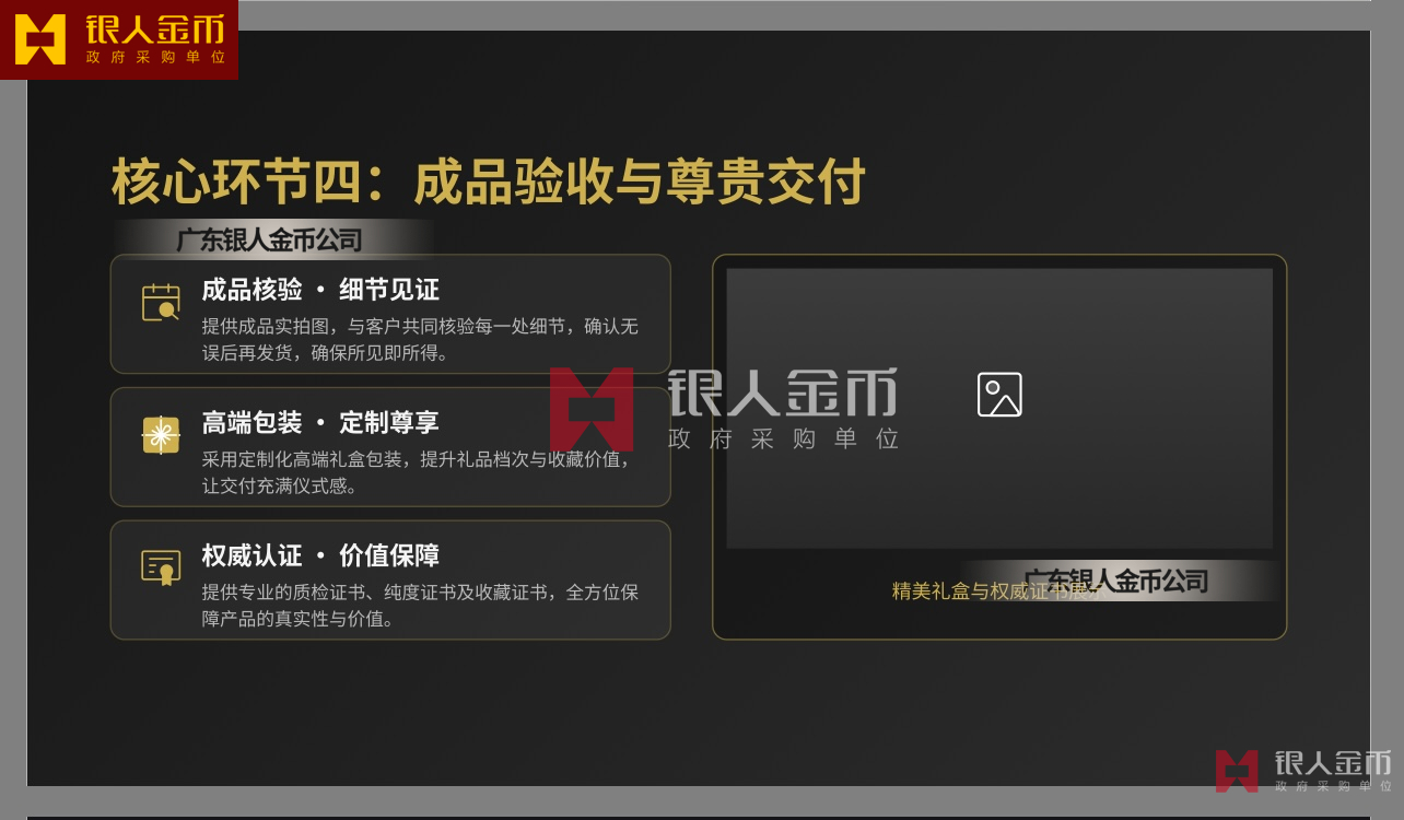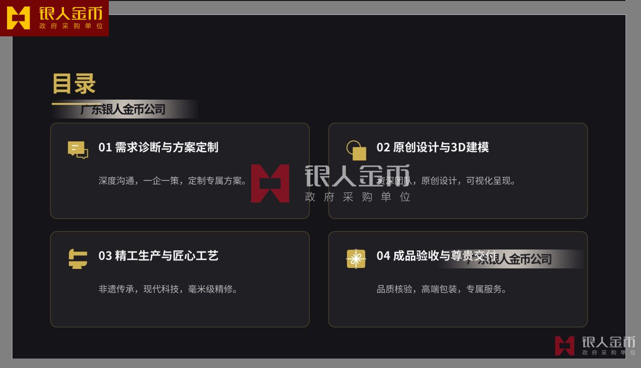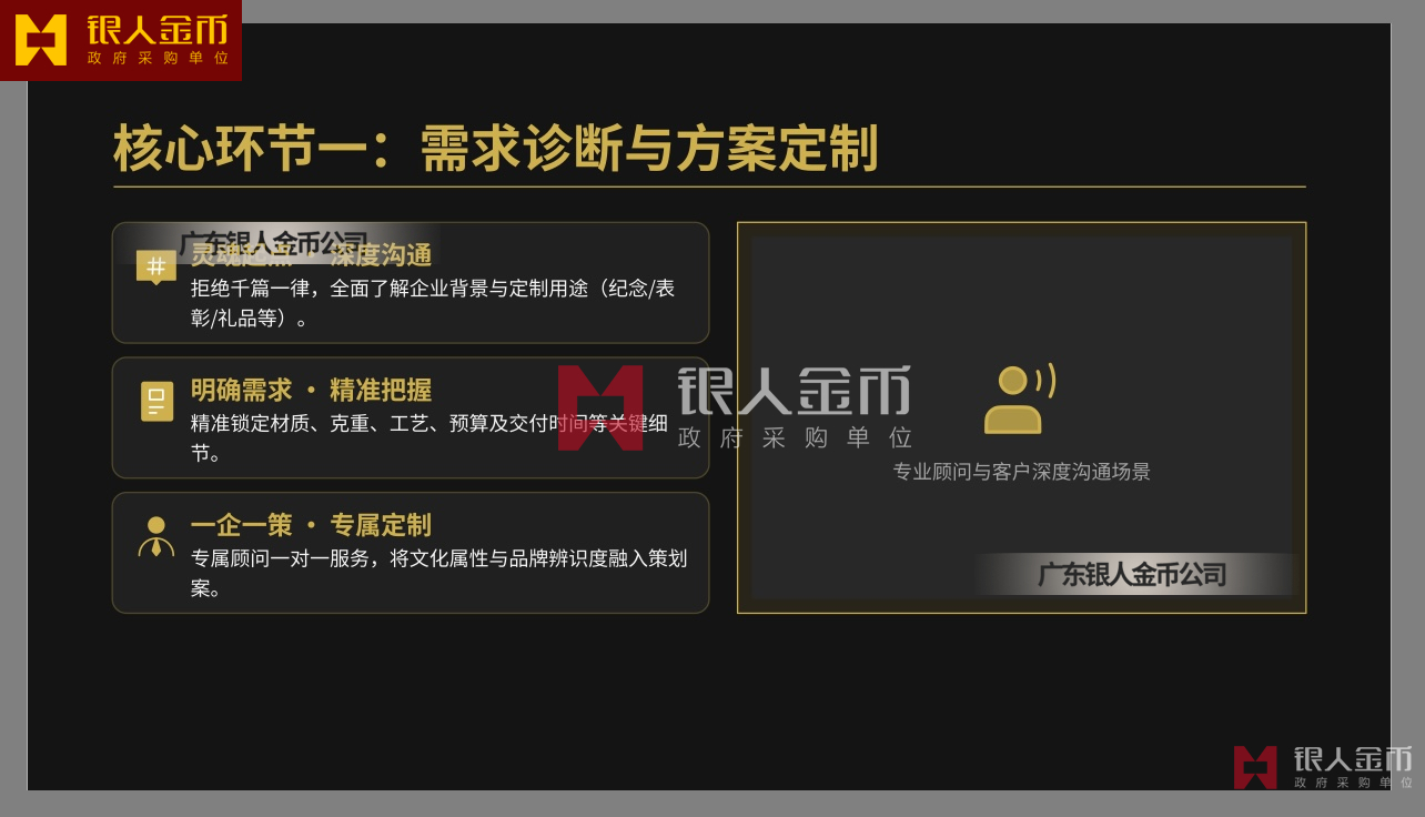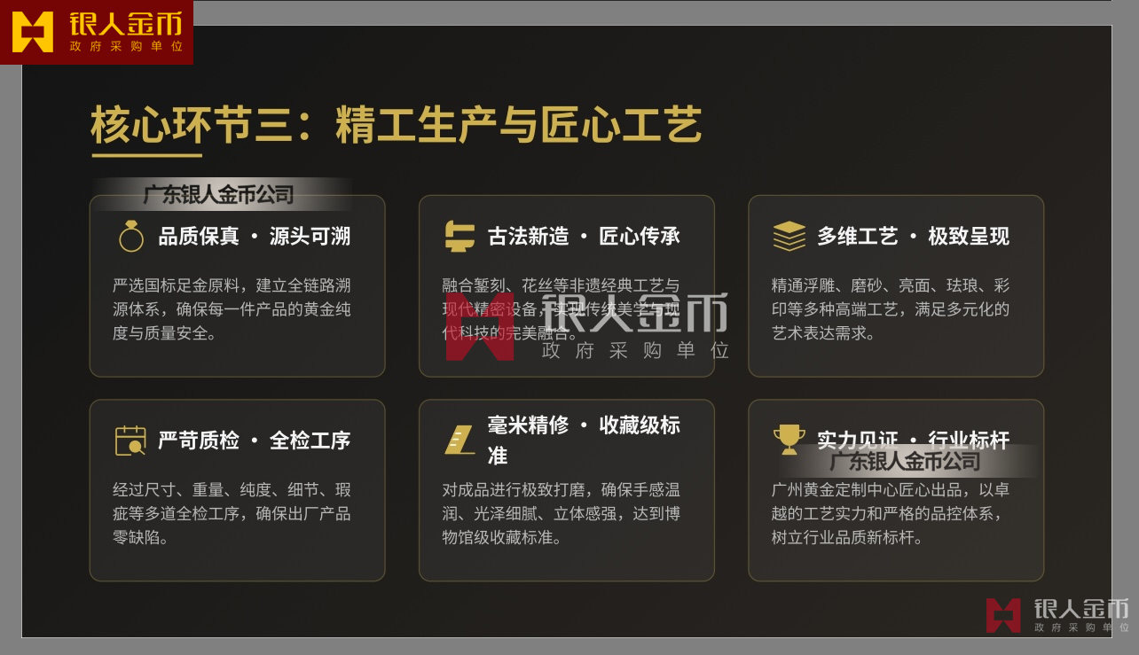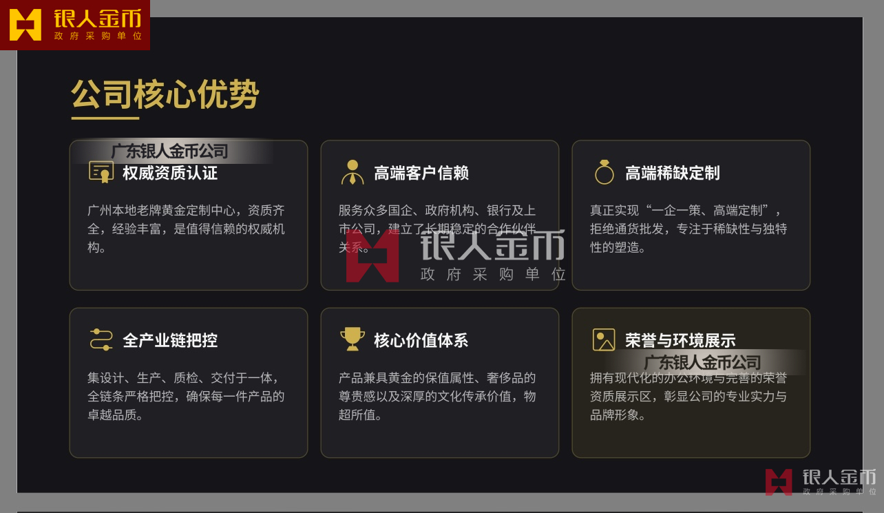 广东银人金币公司针对高端客群对独特性的追求,提供深度的个性化定制服务.基于客户需求,结合黄金制品与企业文化元素,定做独一无二的专属珍品,极大提升了企业的价值感和尊崇感!