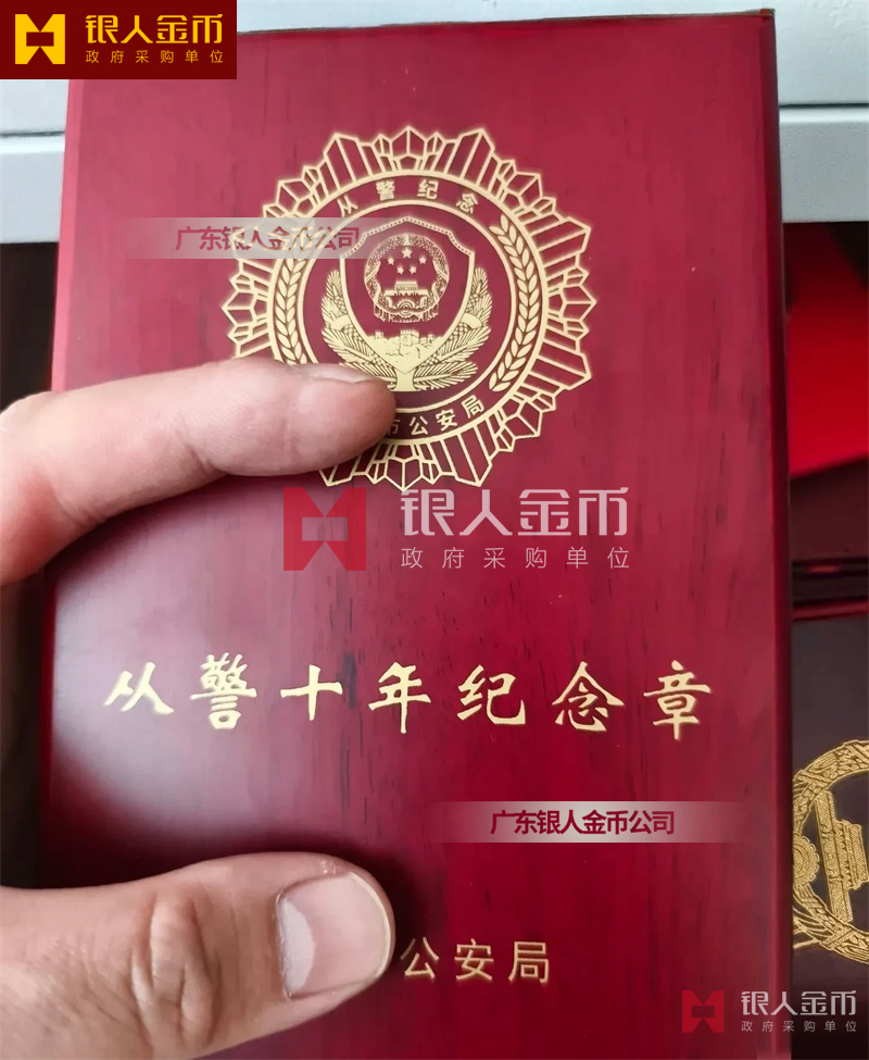 从警纪念章定制,从警年限纪念章定制,从警奖章定制——从警纪念章的底下主体部分都是警徽,上面横档部分是不相同的,有:“从警十年纪念(从警10年纪念章)”、“从警二十年纪念(从警20年纪念章)”、“从警三十年纪念(从警30年纪念章)”、“从警四十年纪念(从警40年纪念章)”不同的,从警十年纪念章(从警10年奖章)表面是镀铜色(铜质奖章)、从警二十年纪念章(从警20年奖章)表面镀银色(银质奖章)、从警三十年纪念章(从警30年奖章)和从警四十年纪念章(从警40年奖章)表面镀金色(金质奖章) ,整体将从警奖章或从警纪念章(从警特定年限纪念章也叫从警章)镶嵌在三折的立式木盒上面,木盒外面配有纸盒,整体做工精美,木盒纸盒上面都刻有警徽从警年限等。